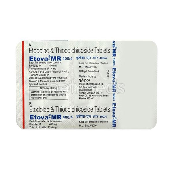 ETOVA MR 400/4MG TABLET is a combination of Etodolac, which works by blocking the release of some chemical substances in the body that are responsible for the pain and inflammation at the site of injury and thiocolchicoside, a skeletal muscle relaxant that modifies the action of a chemical substance produced in the brain with anti-inflammatory and pain-reducing properties to work in the brain and spinal cord. This collective action is useful in providing relief from pain and muscle stiffness or spasm.