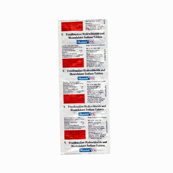 MONTEK FX TABLET is a combination of Fexofenadine and Montelukast which belongs to theroup of medicines called Histamine H1 receptor blockers and Leukotriene receptor antagonists respectively. MONTEK FX TABLET is indicated to treat symptoms of allergic rhinitis (such as sneezing, itchy, runny or blocked nose and itchy, red and watery eyes) in adults and in adolescents (aged 15 years of above).