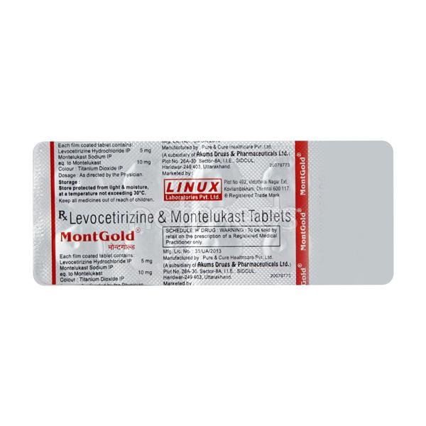MONTGOLD is a combination of Levocetirizine and Montelukast which belongs to the group of medicines called H1 receptor antagonists and Leukotriene receptor antagonists respectively. MONTGOLD is indicated for the treatment and prevention of allergic rhinitis, chronic idiopathic urticaria (allergic skin reaction with red raised itchy bumps on skin) and bronchial asthma in adults and in adolescents (aged 15 years or above).