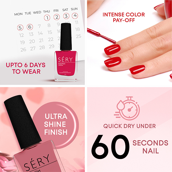 Boost your nail appearance with the Sery Colorflirt Nail Paint – Soft Marshmallow (10ml). It offers a dazzling glossy shine that amplifies your look by leaps and bounds. This Sery nail paint is chip-resistant to ensure a long-lasting finish for up to 6 days. Its UV filters prevent the paint from getting discoloured. The quick-dry formula of this nail polish helps to get mess-free wear. Enriched with vitamin E and avocado for better nail nourishment,Glossy nail paint gives intense colour payoff,Cruelty-free for safe use,Long-lasting nail paint stays put for up to 6 days Before starting, scrub away traces of past lacquer for smooth application. Apply a base coat to clean and dry nails, and wait for 60 seconds. You can then apply two more coats of lacquer for a beautiful, colour-rich look. Finish with a top coat for best results. Store in Cool and Dry Place Vitamin E, Avocado Oil